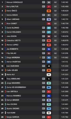 Devant le drapeau à damier, l’Espagnol conserve son avantage, et boucle une séance en tête pour la première fois du week-end. Barry Baltus et Deniz Öncü complètent le top-3, et se qualifient ainsi directement pour la Q2.