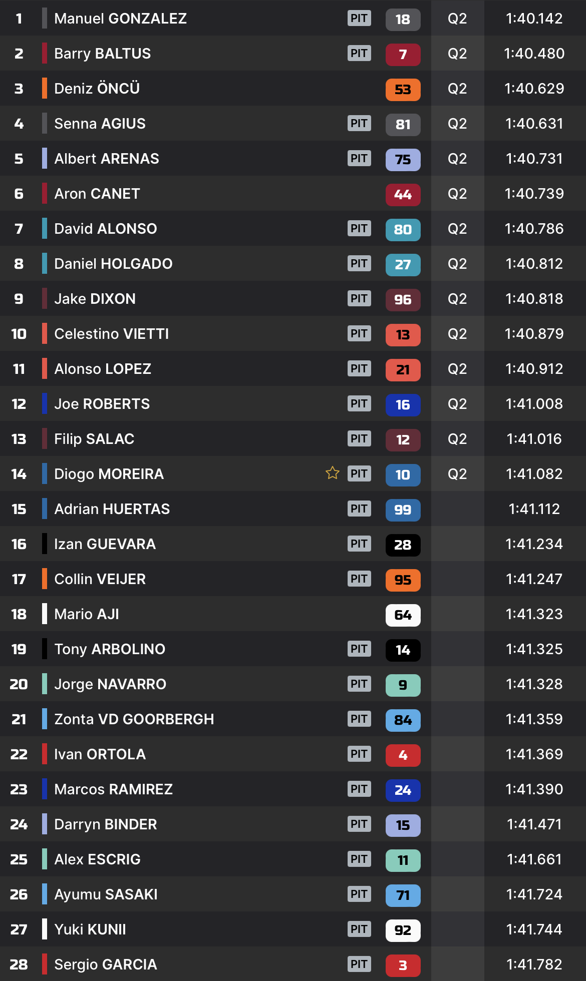 Devant le drapeau à damier, l’Espagnol conserve son avantage, et boucle une séance en tête pour la première fois du week-end. Barry Baltus et Deniz Öncü complètent le top-3, et se qualifient ainsi directement pour la Q2.
