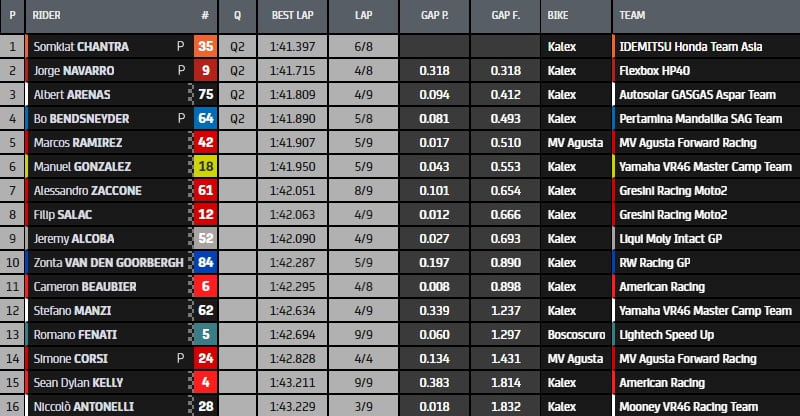 Marcel Schrotter au guidon de Kalex du Team Intact GP est quatrième, devant le rookie et champion Moto3 2021 Pedro Acosta. Le pilote du Red Bull Ajo Team, après avoir impressionné lors des essais hivernaux, ne s’était pas encore exprimé à ces niveaux lors d’un week-end de course. Il est suivi de Joe Roberts (Italtrans), Fermin Aldeguer (Speed ​​Up), Ai Ogura (Team Asia), Gabriel Rodrigo (SAG) et  Celestino Vietti (Mooney VR46 Racing Team), qui clôture le Top Ten. Tony Arbolino (Marc VDS), Augusto Fernandez (Red Bull Ajo), le blessé Aron Canet (Pons) et Lorenzo Dalla Porta (Italtrans) entrent également directement en Q2.