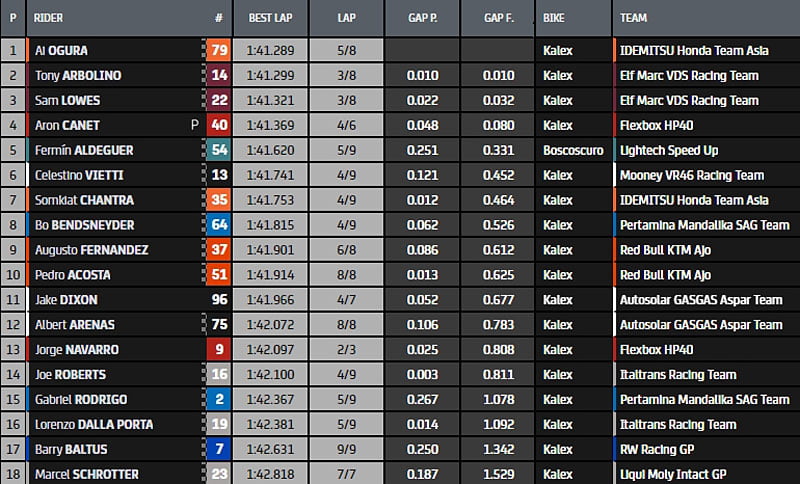 Pole position pour Ogura en 1.41.289s devant Arbolino, Lowes, Canet et Aldeguer.