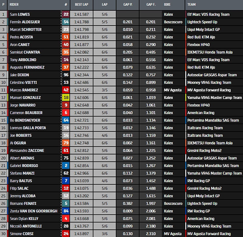 Aron Canet (Flexbox HP40) malgré sa récente opération au poignet a terminé quatrième devant Fermin Aldeguer (Speed Up) et le leader du championnat du monde Celestino Vietti (Mooney VR46 Racing). Septième temps pour Somkiat Chantra (Team Asia) devant Bo Bendsneyder (SAG) et Augusto Fernandez (Ajo). Pedro Acosta (Ajo) complète le top dix.