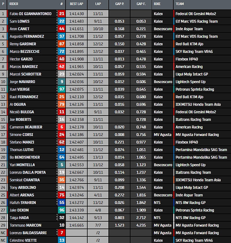 Le top 10 est complété par Augusto Fernández (ELF Marc VDS Racing) septième place, Joe Roberts (Italtrans Racing Team), le débutant Ai Ogura (Idemitsu Honda Team Asia) et Jake Dixon (Petronas Sprinta Racing).
