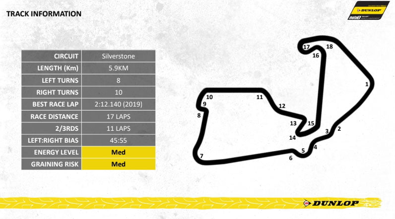 Toutefois, le pneu Supersoft ne correspond aux exigences du tracé de Silverstone, où Dunlop y apporte une allocation classique avec un arrière tendre (1) et un arrière médium (2), ce dernier ayant recueilli la grande majorité des choix en 2019. A l’avant, les pilotes pourront choisir entre un tendre (1) et un dur (3).
