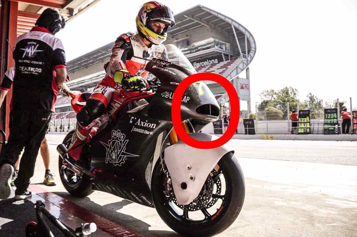 La machine du team Forward a particulièrement attiré l’attention des initiés en raison de sa configuration aérodynamique. Dans une version avec une coque qui était évidemment destinée au développement, à tel point que la moto italienne présentait une prise de boîte à air de forme ovale, avec une séparation en son milieu. Une conception résolument particulière, conçue par le Centre de recherche de Castiglioni et l’équipe de Forward Racing.