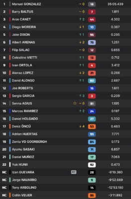 Barry Baltus trouve rapidement son rythme dans cette course, et avant l’entame du quatrième tour, le Belge s’est déjà défait d’Albert Arenas et de Filip Salac, pour rejoindre le groupe de tête. Il ne tardera pas à prendre l’avantage sur Jake Dixon. Cependant, à ce moment-là, Manuel Gonzalez, son principal adversaire ce week-end, prend la tête de la course en doublant Diogo Moreira.