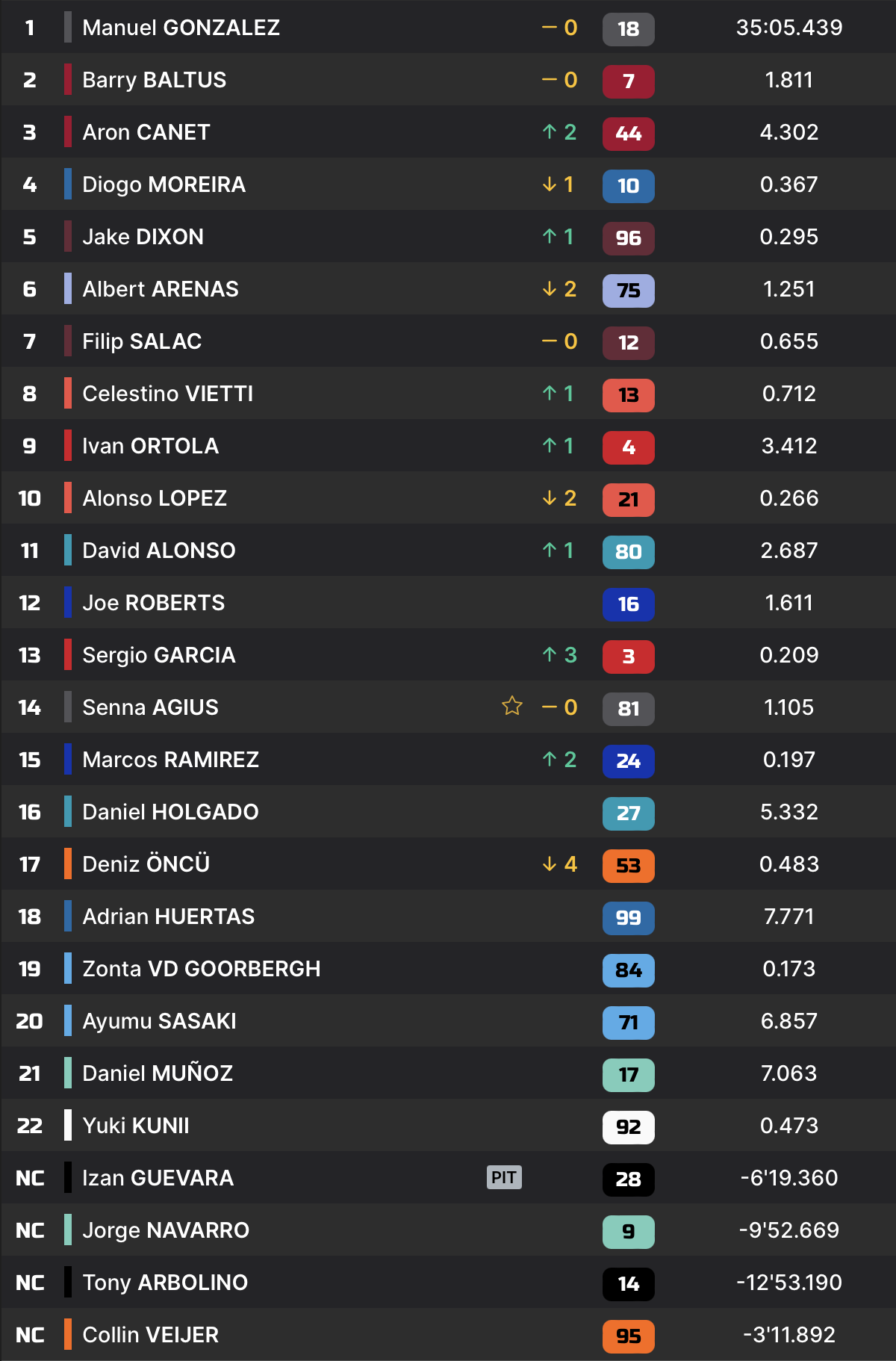 Moreira résiste cependant, et Canet perd les deux positions qu’il venait de gagner en tentant de résister. Il lui faudra deux tours pour les reprendre, au prix de duels musclés avec ses adversaires. Installé en troisième position, il compte 4 secondes de retard sur le duo de tête.