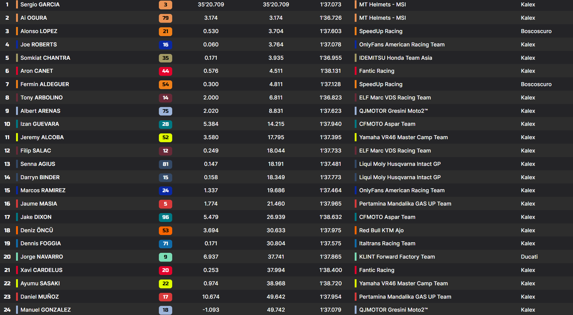 Un confort de courte durée, puisqu’Aron Canet est parvenu à stabiliser l’écart à 1.4 secondes une fois promu en deuxième position. Le poleman du GP de France ne parvient cependant pas à revenir sur le leader, et verra même Alonso Lopez revenir en fin de course.