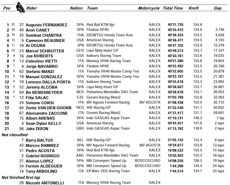 Alonso Lopez, qui fait un retour à temps plein en Moto2, est sixième et le meilleur pilote non-Kalex pour son meilleur résultat de qualification en Moto2. Le leader du championnat, Celestino Vietti, est 19ème après sa pire qualification depuis Aragon l’an dernier, où il était 26ème.