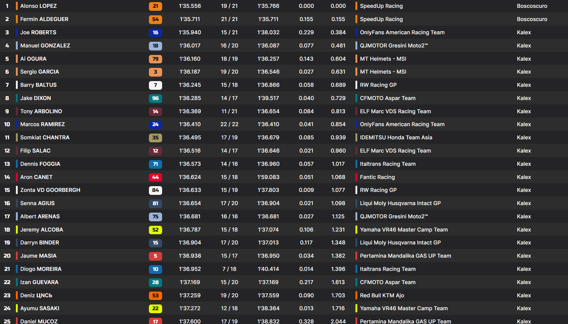 Alonso Lopez est toutefois en piste au même moment, et parvient à claquer un tour en 1:35.831 pour déloger l’Américain. Le n°21 confirme avec une marque en 1:35.556. Roberts tente de répondre, mais échoue à trois dixièmes, alors que juste derrière lui, Fermin Aldeguer se réveille et décroche la troisième position en 1;36.003.