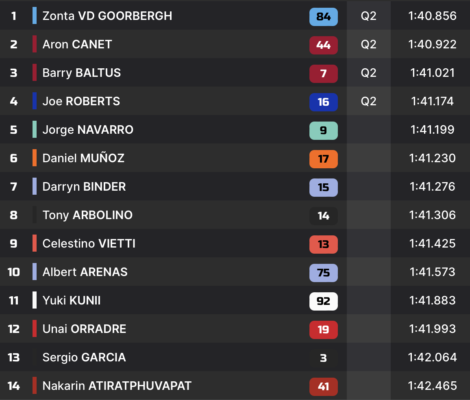 Cette tendance se confirme dès les premiers tours de roue, où es deux hommes flirtent avec les avant-postes. Devant le drapeau à damier, c’est toutefois Zonta van der Goorbergh qui subtilise le meilleur temps, en 1:40.856. Mais les deux pilotes Fantic ne sont pas loin. Aron Canet et Barry Baltus complètent le top-3, qui se tient en 150 millièmes. Autre pilote figurant sur la liste des favoris à une qualification en Q2, Joe Roberts, le vainqueur du Grand Prix de Tchéquie, prend le quatrième temps.