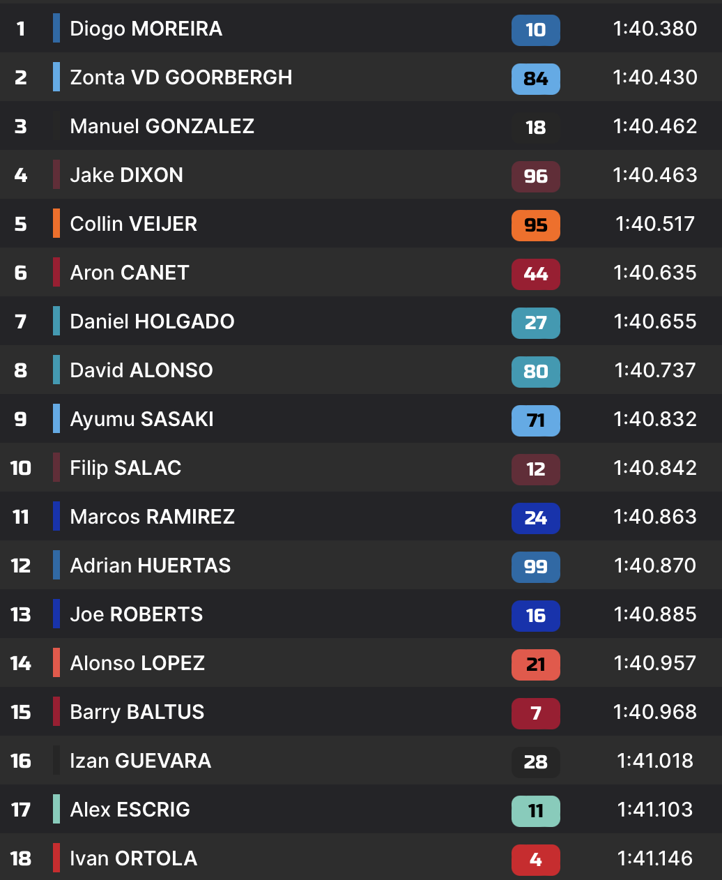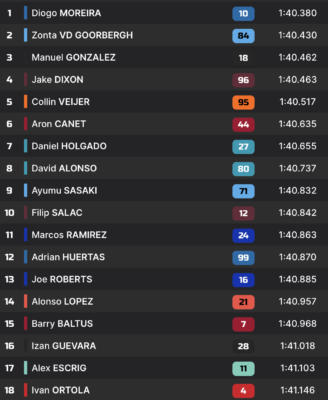 Mais comme rien n’est joué avant les derniers passages de chacun, le classement évolue encore beaucoup en fin de séance. Zonta van der Goorbergh améliore, mais échoue à 50 millièmes du Brésilien. Jake Dixon aussi, mais termine juste derrière Manuel Gonzalez. De leurs côtés, les chronos de Moreira et Gonzalez ne bougent pas. Leurs tentatives précédentes sont tout de même suffisantes pour les maintenir aux avant-postes.