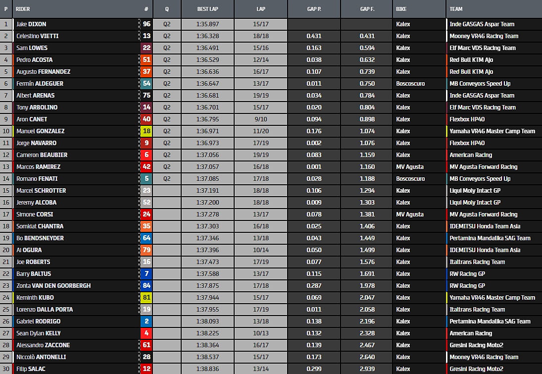 Le pilote du Team Marc VDS a réalisé la meilleure performance avec un temps de 1:44.439, obtenu sur le 17ème des 17 tours. Derrière lui, à 1.043s on trouvait Joe Roberts, au guidon du Kalex de l’équipe ItalTrans et Tony Arbolino, troisième avec le Kalex de l’équipe Marc VDS. Celestino Vietti (Mooney VR46 Racing Team), vainqueur au Qatar, a terminé quatrième devant Jake Dixon (GASGAS) et Fermin Aldeguer (Speedup).