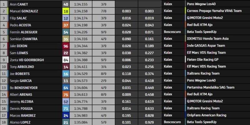 C’est incroyable ! Tous poussent, et à moins de deux minutes de la fin, les quatre premiers se tiennent en un centième de seconde ! L’atmosphère est insoutenable. Personne n’améliore cependant. Les temps ne sont pas plus rapides qu’en P3, mais tout peut arriver dans ce dernier tour. Finalement, personne ne peut battre la marque réalisée plus tôt par Arón Canet ! Il s’élancera depuis la meilleure position, devant Manuel González et Filip Salač. Pedro Acosta est quatrième. Les cinq premiers sont en moins d’un centième. Il s’agit d’une des qualifications les plus serrées de tous les temps, assurément. Cela donne de l’espoir pour la course de demain, c’est une certitude.