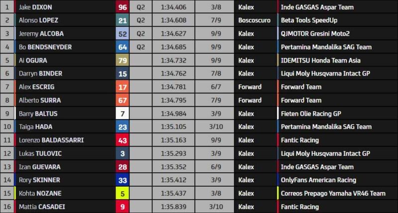 Beaucoup sont très rapides, dont Alonso López et Darryn Binder (Liqui Moly Husqvarna Intact GP). Tout va se jouer dans le dernier tour. Dixon est aux stands ; il ne pourra pas répondre ! Mais alors qu’au moins trois pilotes allumaient en rouge dans le premier secteur, aucun ne parvient à améliorer ! Jake Dixon se qualifie en premier, et sera suivi en Q2 par Alonso López, Jeremy Alcoba (QJMotor Gresini Racing) et Bo Bendsneyder (Pertamina Mandalika SAG Team). Ai Ogura ne sera pas de la partie ! Désillusion pour le Japonais.