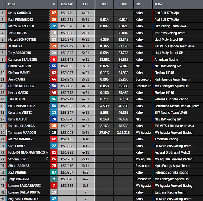 À la fin du premier tour, Raúl Fernández précède Remy Gardner, Tony Arbolino, Sam Lowes, Fabio Di Giannantonio, Jorge Navarro, Marco Bezzecchi, Joe Roberts (Italtrans Racing Team), Xavi Vierge (Petronas Sprinta Racing) et Marcel Schrötter (Liqui Moly Intact GP).