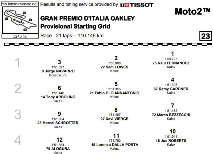 En résumé, les 5 hommes forts du championnats partiront des 7 premières places, mais Raúl Fernández et Sam Lowes ont clairement démontré avoir un petit plus sur le tracé italien !