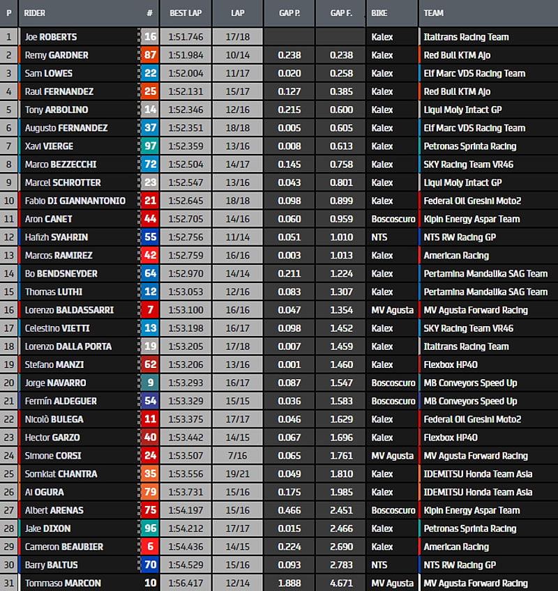 Sous le drapeau à damier, c’est Joe Roberts qui clôture les débats en 1’51.746. Il devance Gardner, Sam Lowes puis les deux rookies Raul Fernandez et Tony Arbolino. Bezzecchi est huitième et Di Giannantonio dixième.
