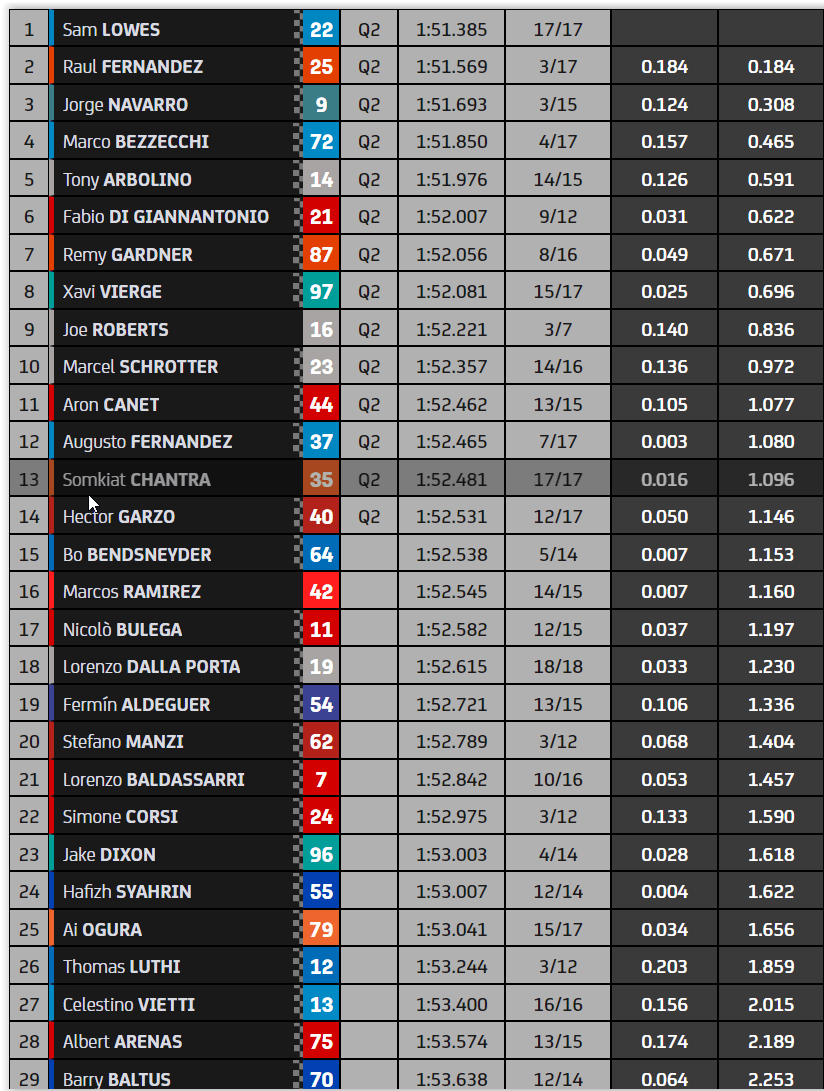 Sam Lowes (ELF Marc VDS Racing) se voyait, pour sa part, crédité du troisième temps. Dans son sillage, on retrouvait Raúl Fernández (Red Bull KTM Ajo), accompagné de Tony Arbolino (Liqui Moly Intact GP) et d’Augusto Fernández (ELF Marc VDS Racing).