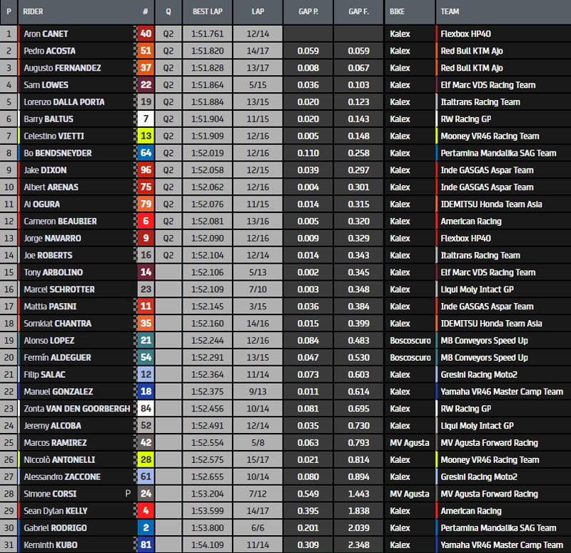 Fin de session, les 14 pilotes qui sont intégrés à la Q2 sont : Canet, Acosta, Fernandez, Lowes, Dalla Porta, Baltus, Vietti, Bendsneyder, Dixon, Arenas, Ogura, Beaubier, Navarro, Roberts