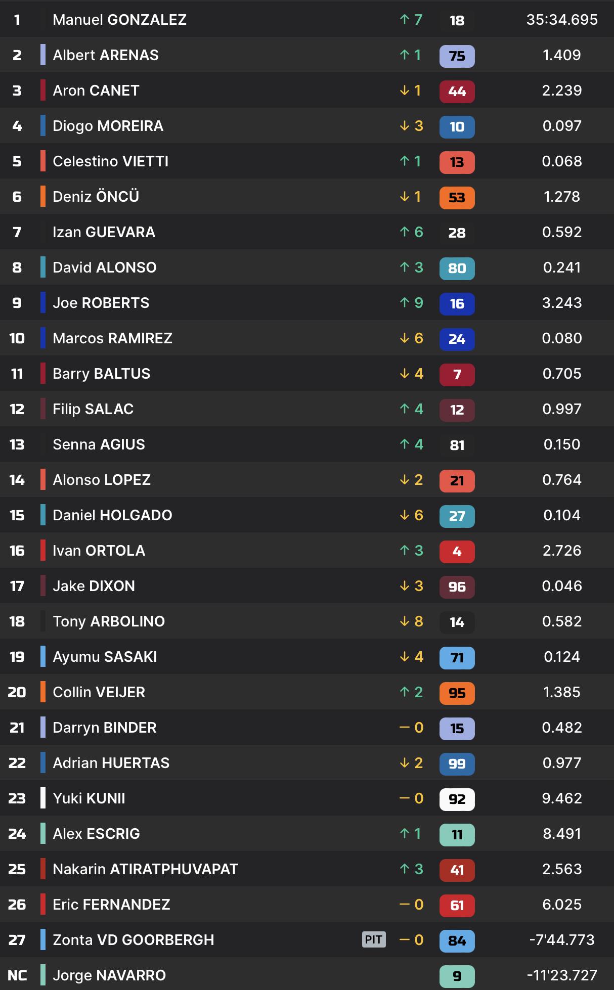 Le rythme ne cessera de s’accélérer en tête de la course, et le duo de tête, toujours composé de Manuel Gonzalez et Albert Arenas pointe une seconde devant Diogo Moreira et Aron Canet au douzième passage. Derrière, Deniz Oncu accuse un retard de trois secondes sur l’Espagnol en cinquième position.