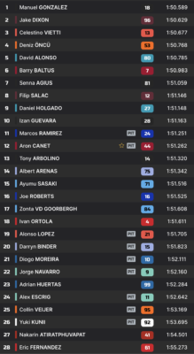 Le Sprint final débute avec un drapeau jaune, causé par la chute de Eric Fernandez. Manuel Gonzalez enchaîne ensuite avec un temps en 1:50.589, pour reprendre la première place provisoire. Jake Dixon tente de revenir à la charge, mais échoue à 40 millièmes. Celestino Vietti l’imite quelques instants plus tard, échouant à moins d’un dixième également.