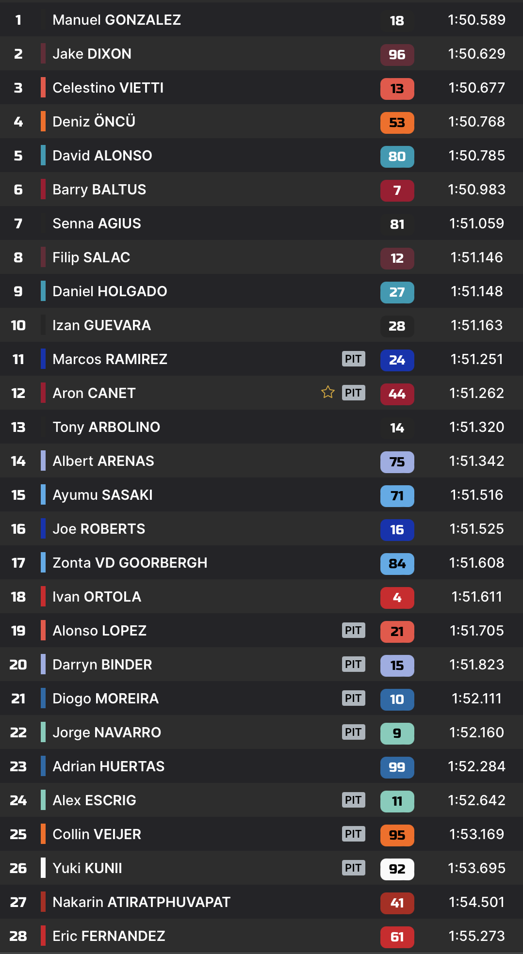 Devant le drapeau à damier, le leader du championnat conserve la tête de la séance. Jake Dixon et Celestino Vietti complètent le top-3. Le dernier vainqueur en date, Deniz Öncü, est également dans le coup dès le début, s’offrant le 4e temps. David Alonso, désireux de corriger le tir après l’accrochage qu’il a eu avec son équipier en Aragon, se place 5e en FP1.