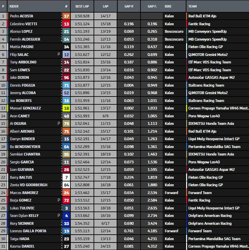 Acosta améliore en 1.52.390s puis le tour suivant en 1.51.748s. Lopez, Arenas, Vietti et Arbolino ferment la marche de ce top5 provisoire