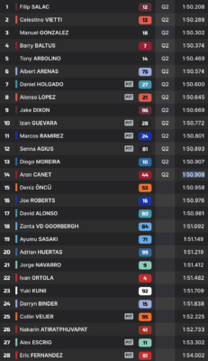 Aron Canet passe la fin de séance dans une positon inconfortable, bloqué au treizième rang, et menacé par une exclusion du top-14, et donc d’un ticket pour la Q2. Il parvient finalement à décrocher la dernière place disponible s’assurer un samedi après-midi plus tranquille, avec un temps en 1:50.908.
