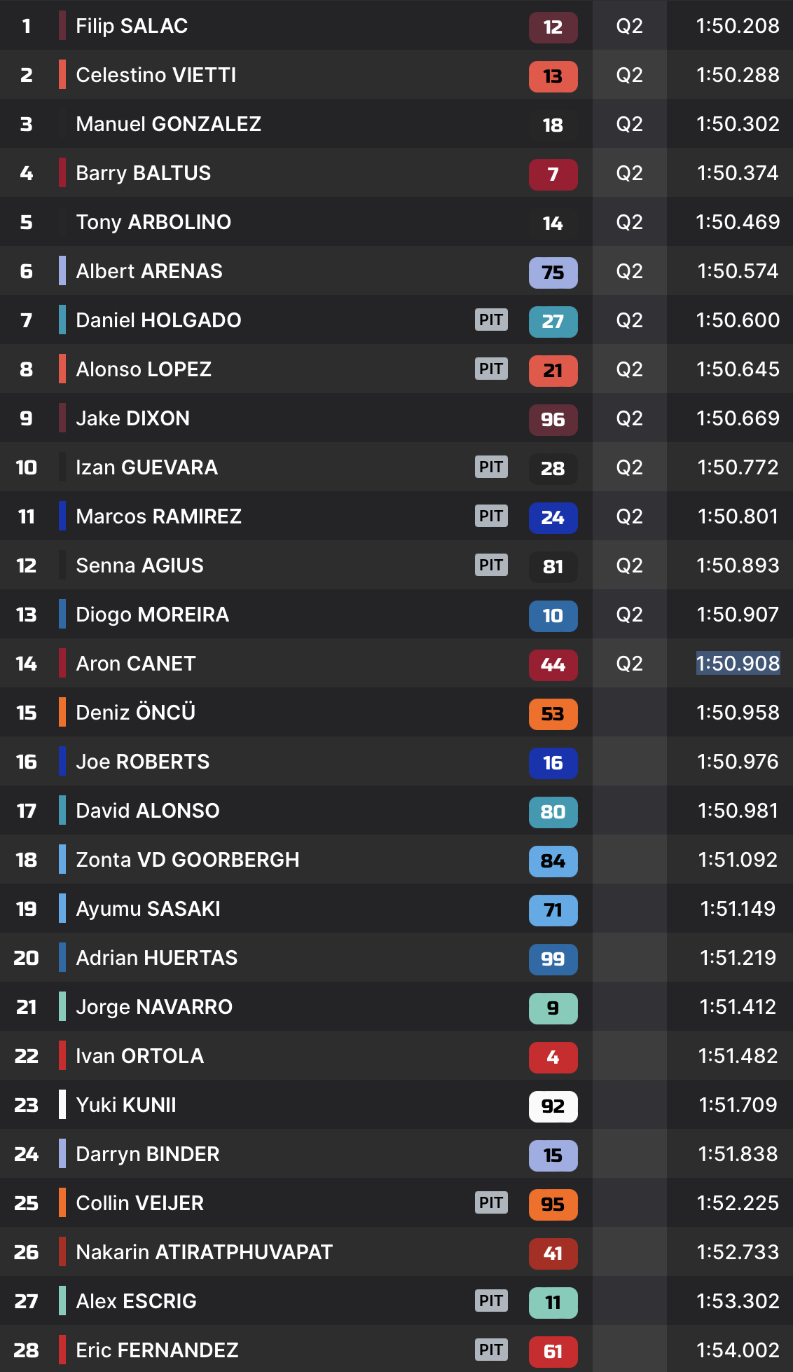 Au moment de lancer les hostilités, c’est Filip Salac qui s’illustre, posant une marque de référence en 1:50.208, déjà trois dixièmes plus rapide que le meilleur temps de la matinée. Il devance alors son ancien équipier, Tony Arbolino, et Albert Arenas, alors que le top-3 se tient en 3 dixièmes.