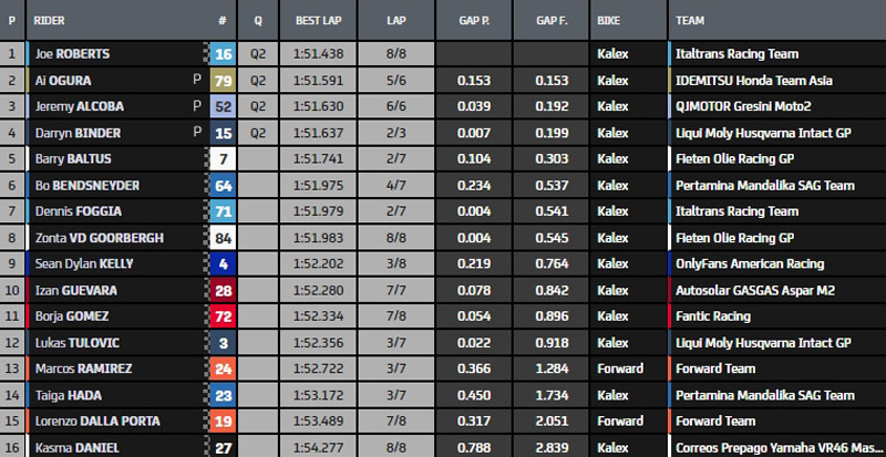 Seront forcés à en passer par la Q1, entre autres: Ai Ogura (Kalex, Idemitsu Honda Team Asia, #79), Dennis Foggia (Kalex, Italtrans Racing Team, #71), Barry Baltus (Kalex, Fieten Olie Racing GP, #7), Darryn Binder (Kalex, Liqui Moly Husqvarna Intact GP, #15), Joe Roberts (Kalex, Italtrans Racing Team, #16), Jeremy Alcoba (Kalex, QJMOTOR Gresini Moto2, #52), Bo Bendsneyder (Kalex, Pertamina Mandalika SAG Team, #64) et Lorenzo Dalla Porta, ce dernier pilotant pour Forward Racing pour les trois prochaines courses.