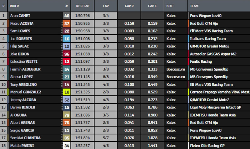 Derrière lui à 0.192s on retrouve Fermín Aldeguer (Boscoscuro, CAG SpeedUp, #54), qui à son tour devance Jake Dixon (Kalex, Inde GASGAS Aspar Team, #96) de seulement 68 millièmes.