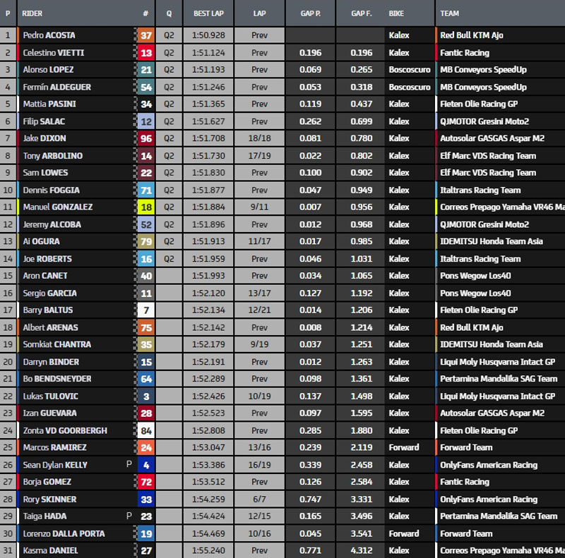 Jeremy Alcoba (Gresini), Joe Roberts (Italtrans), Manuel Gonzalez (VR46 MasterCamp) et Aron Canet (Pons) se sont également qualifiés pour la Q2 provisoire. Lorenzo Dalla Porta, mis à pied par l’équipe SAG et à présent chez Forward a terminé 29e.