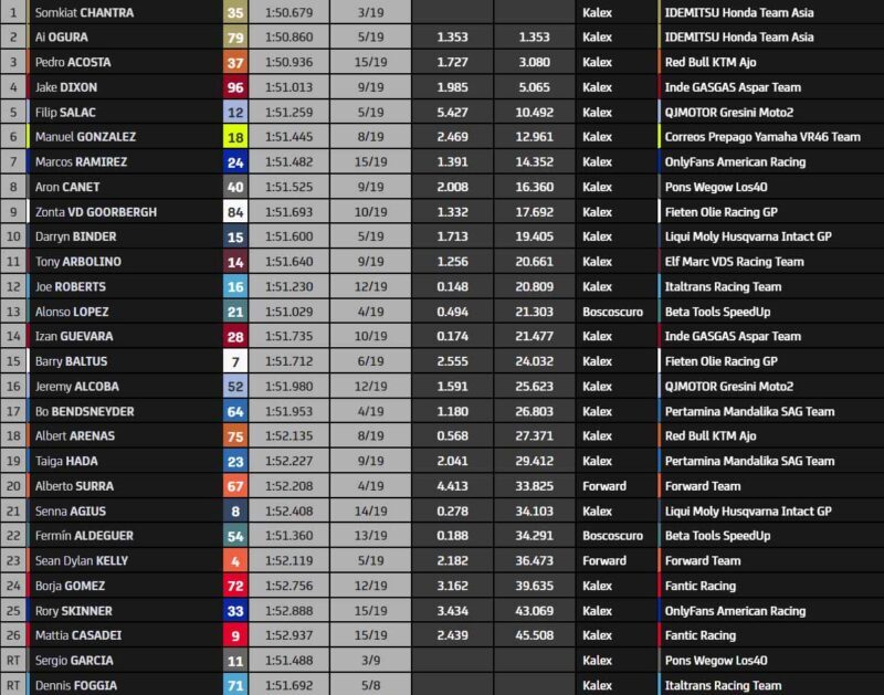 Après une course relativement plate, Somkiat Chantra s’impose après avoir mené depuis le premier virage. Ai Ogura est deuxième sur ses terres, et Pedro Acosta complète le podium. Il fait une excellente opération au classement général et prend une première option sur le titre mondial, avec 50 points d’avance sur Tony Arbolino.