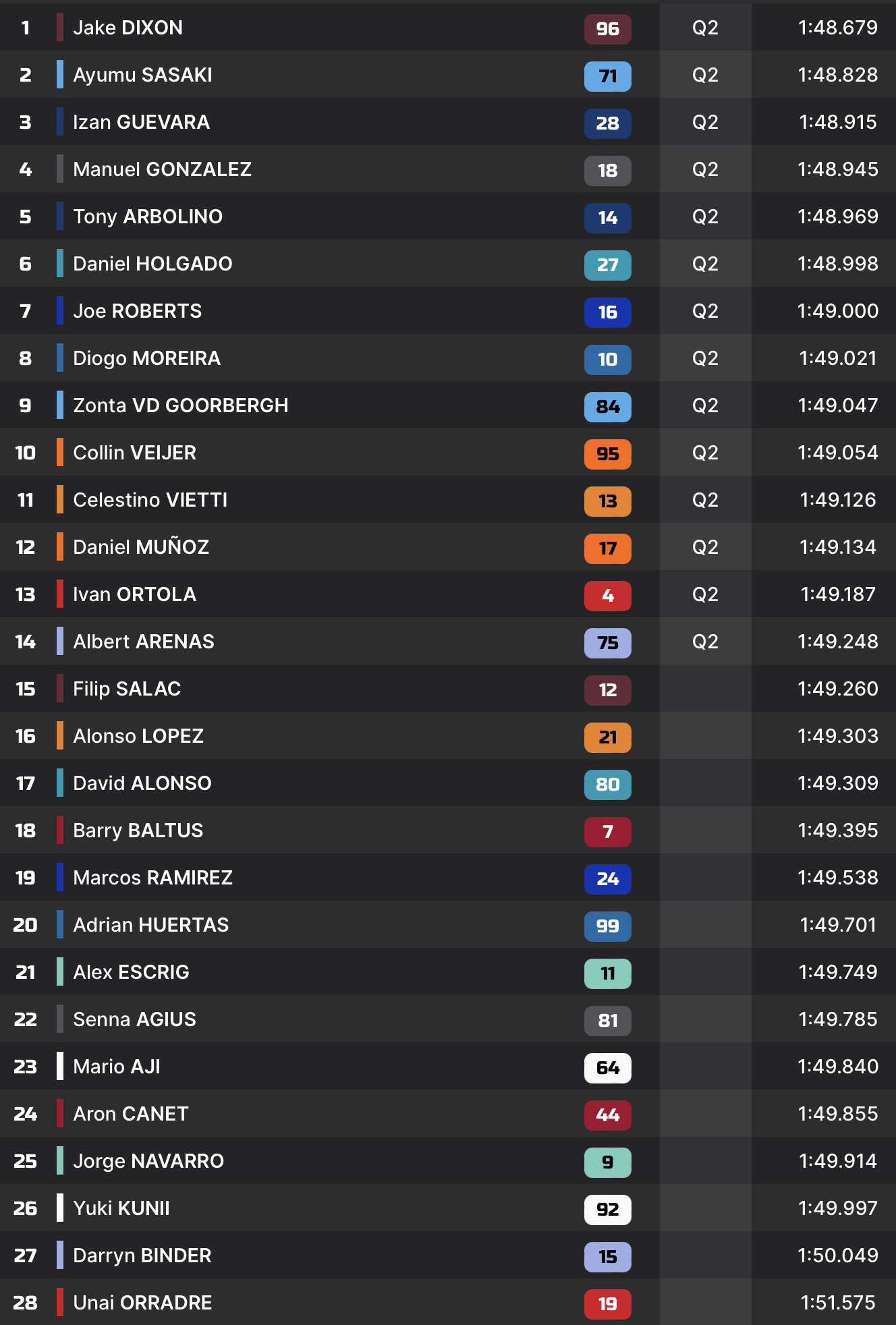 Si les 14 premiers temps sont suffisants pour se qualifier, c’est Ayumu Sasaki qui s’offre l’honneur de régner au sommet du marquoir durant la majeure partie de la séance. Très vite devant, le Japonais, régional de l’étape, commence par signer le premier tour de l’histoire du Moto2 dans la minute 48. Un cap que Jake Dixon était déjà tout proche de franchir dans la matinée.