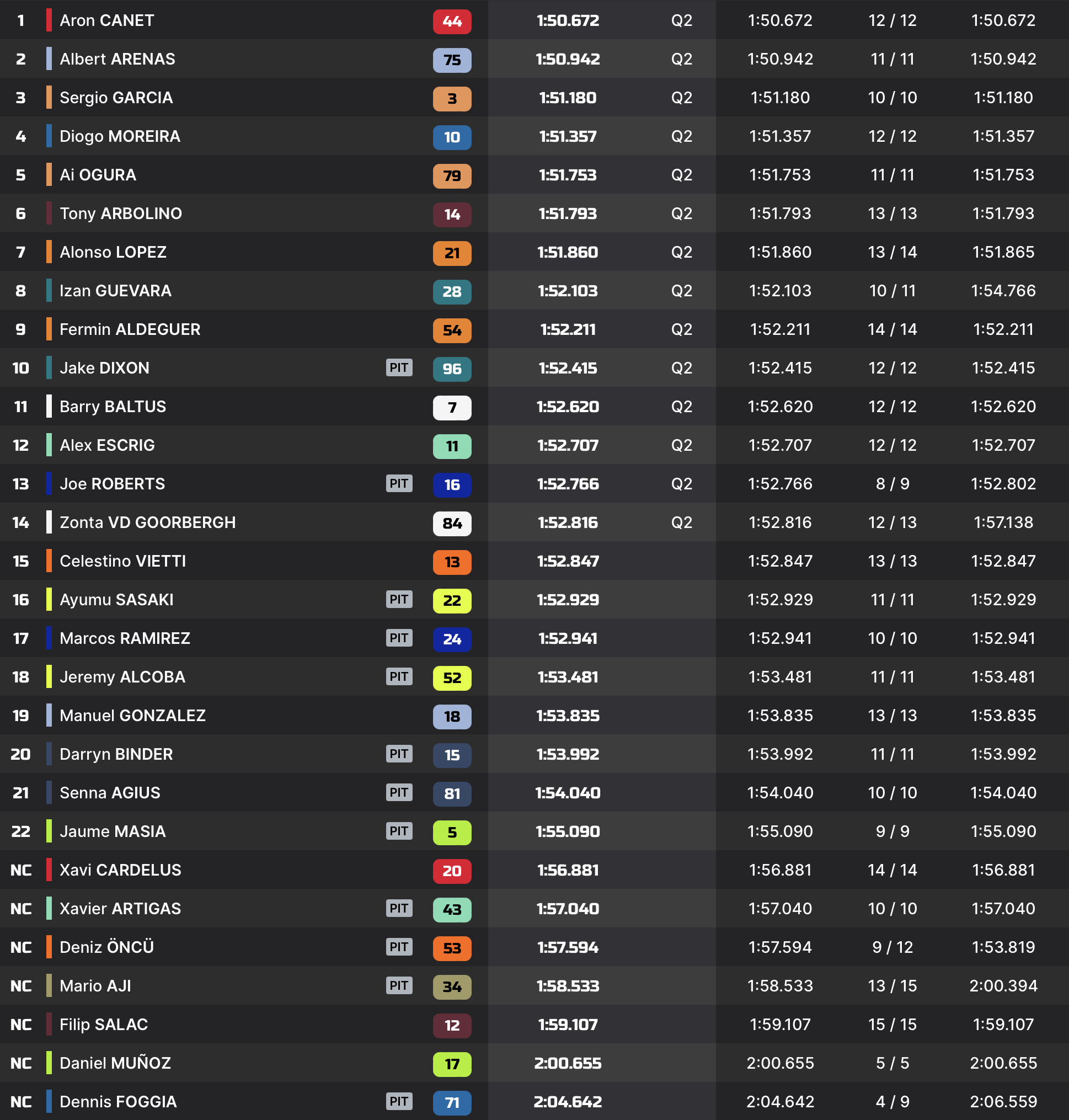 À deux minutes de la fin, Albert Arenas pose une marque en 1:51.795. Il n’est alors qu’à un peu plus d’une seconde du top-14 de la veille. Il manquera quelques minutes d’action pour les pilotes passés à côté de leur vendredi ne puisse signer une tentative similaire à celles de la veille.