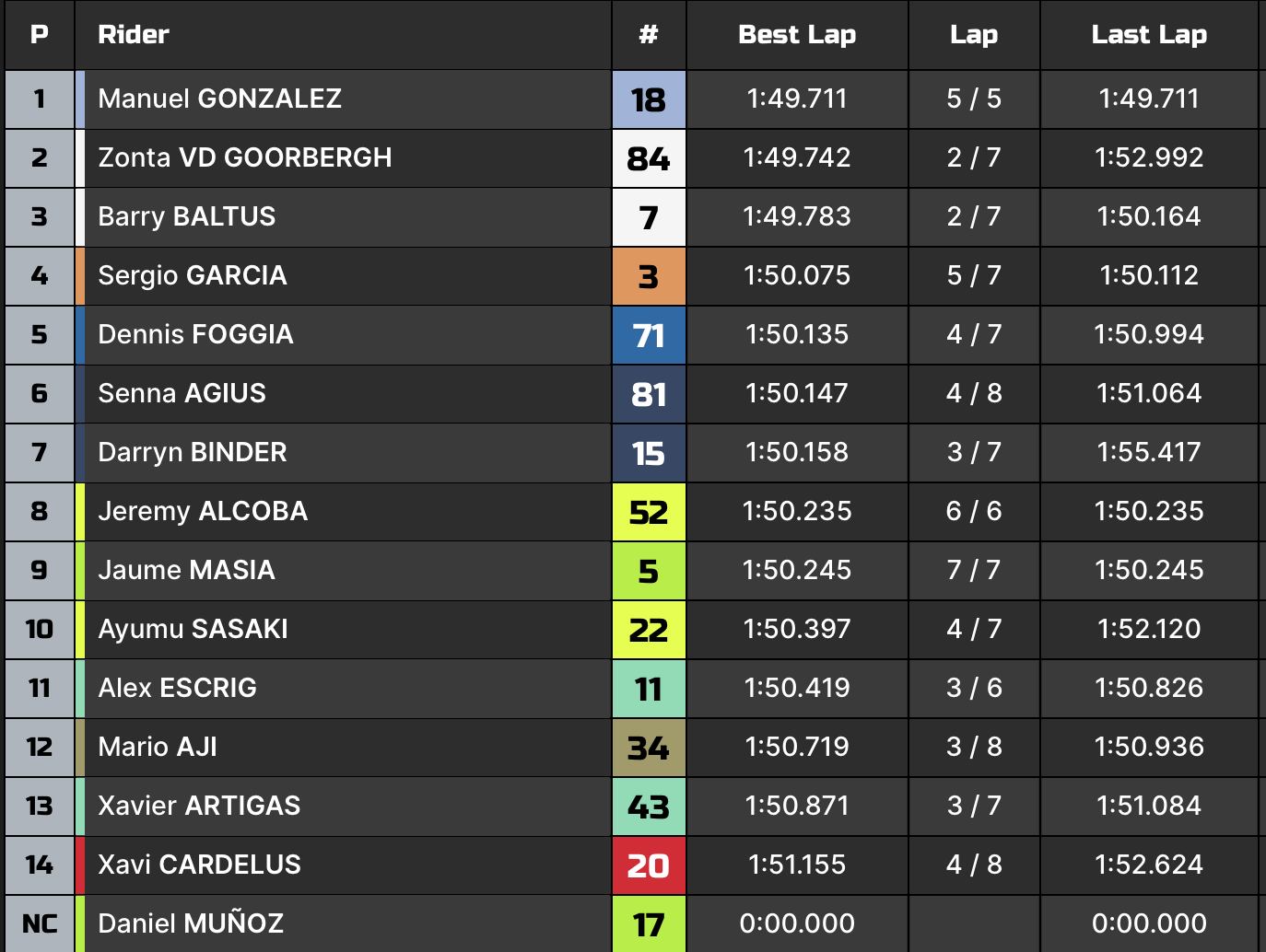 Côté chrono, trois pilotes ont véritablement fait la différence au cours de cette Q1, en conservant une longueur d’avance sur leurs adversaires lors des premières tentatives. Ainsi, Manugel Gonzalez signe le meilleur temps en 1:49.742. L’Espagnol est suivi par les deux pilotes du team RW Racing GP, Zonta van der Goorbergh, et le Belge, Barry Baltus. Les trois hommes sont les seuls à tourner dans la minute 49.