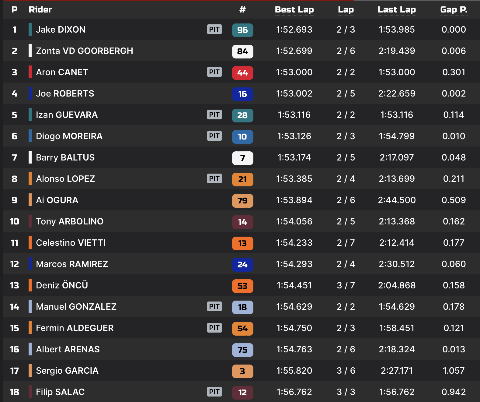 Alors que les deux premiers conservent leur classement, ils sont suivis par Aron Canet et Joe Roberts. Ai Ogura joue de malchance à domicile et ne se classe que neuvième. La course promet d’être animée, alors que quelques hommes forts de ce week-end débuteront l’épreuve plus loin que prévu sur la grille de départ.