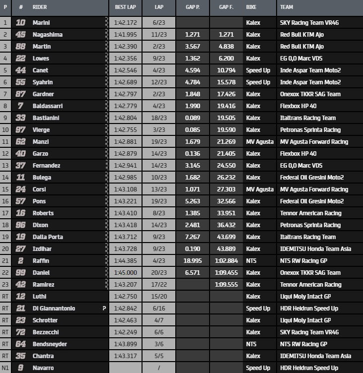 Au classement du championnat, Tetsuta Nagashima conserve le leadership avec 45 points devant Lorenzo Baldassarri (28 points) et Luca Marini (25 points).
