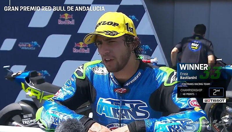 Enea Bastianini (1er) : « Je suis vraiment content car même ce matin j’étais rapide, et hier après-midi, je me suis dit intérieurement que je pouvais gagner cette course. J’ai tout donné dès les premiers tours et lors des 10 derniers tours je suis parvenu à avoir un écart assez important avec Marini. Ma condition physique est très bonne, la moto était incroyable, je remercie mon équipe. Je dédie cette victoire à Livio, un ami spécial à moi qui n’est plus là, qui est haut ciel. »