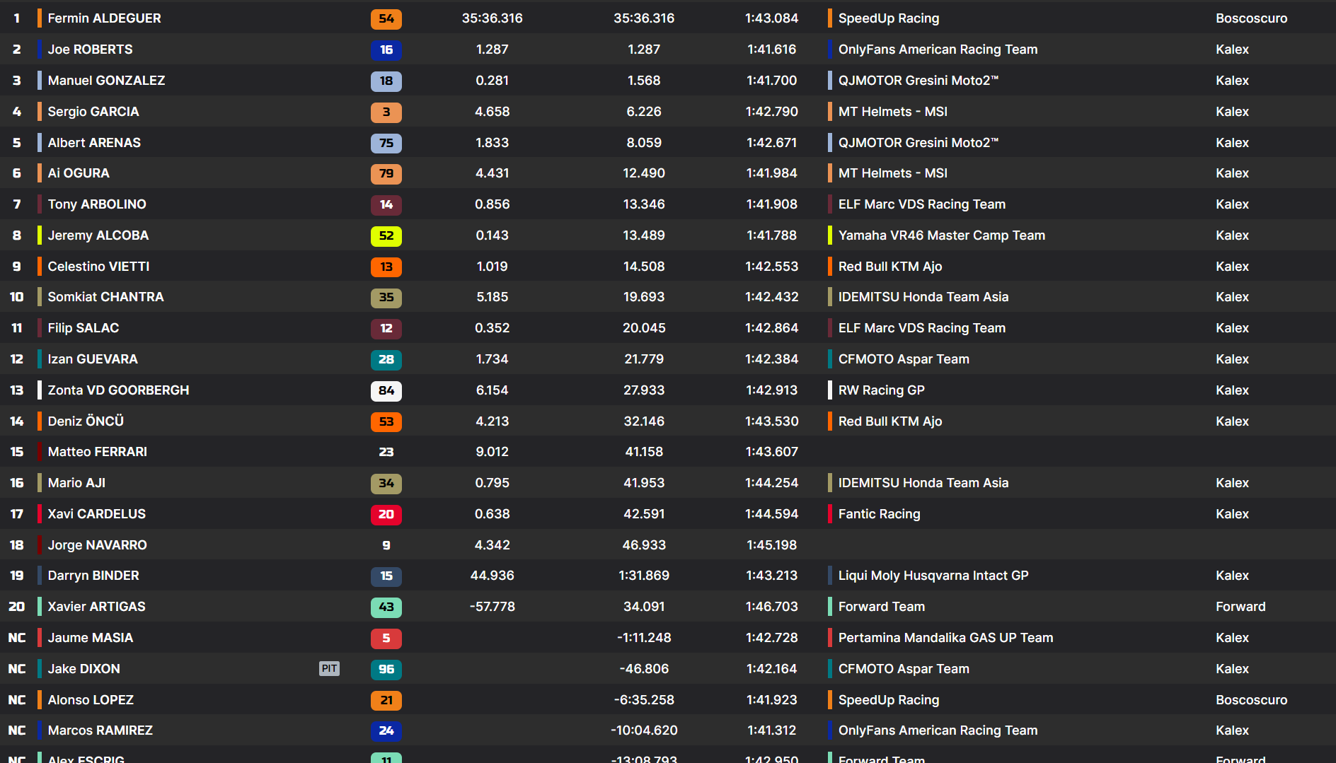 Le leader a alors répondu à toutes les attaques du n°54, avant que celui-ci ne parvienne à passer au troisième tour. Aldeguer a ensuite haussé le rythme, et parvenait à distancer un peu plus son adversaire lors de chaque passage par le premier secteur.