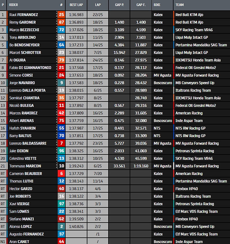 Pour retrouver les hommes forts du championnats, il faut regarder à la 7e place pour Remy Gardner, à la 10e pour Sam Lowes, voire même à la 15e en ce qui concerne le dernier vainqueur en date Fabio Di Giannantonio !