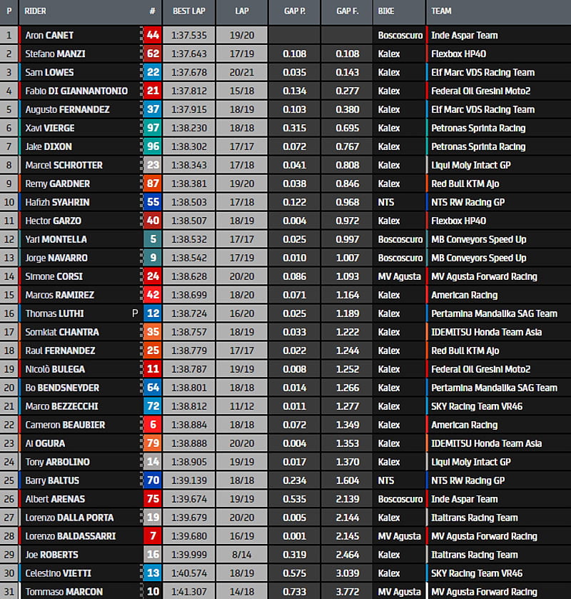Sous le drapeau à damier, Montella chute au vitrage 11 et c’est Canet qui boucle l’exercice en tête en 1’37.535 en montrant son mécontentement à Sam Lowes. Manzi suit comme l’Anglais, puis le vainqueur de Jerez Di Giannantonio. Augusto Fernandez ferme le top 5. Gardner est neuvième et Raul Fernandez 19e.