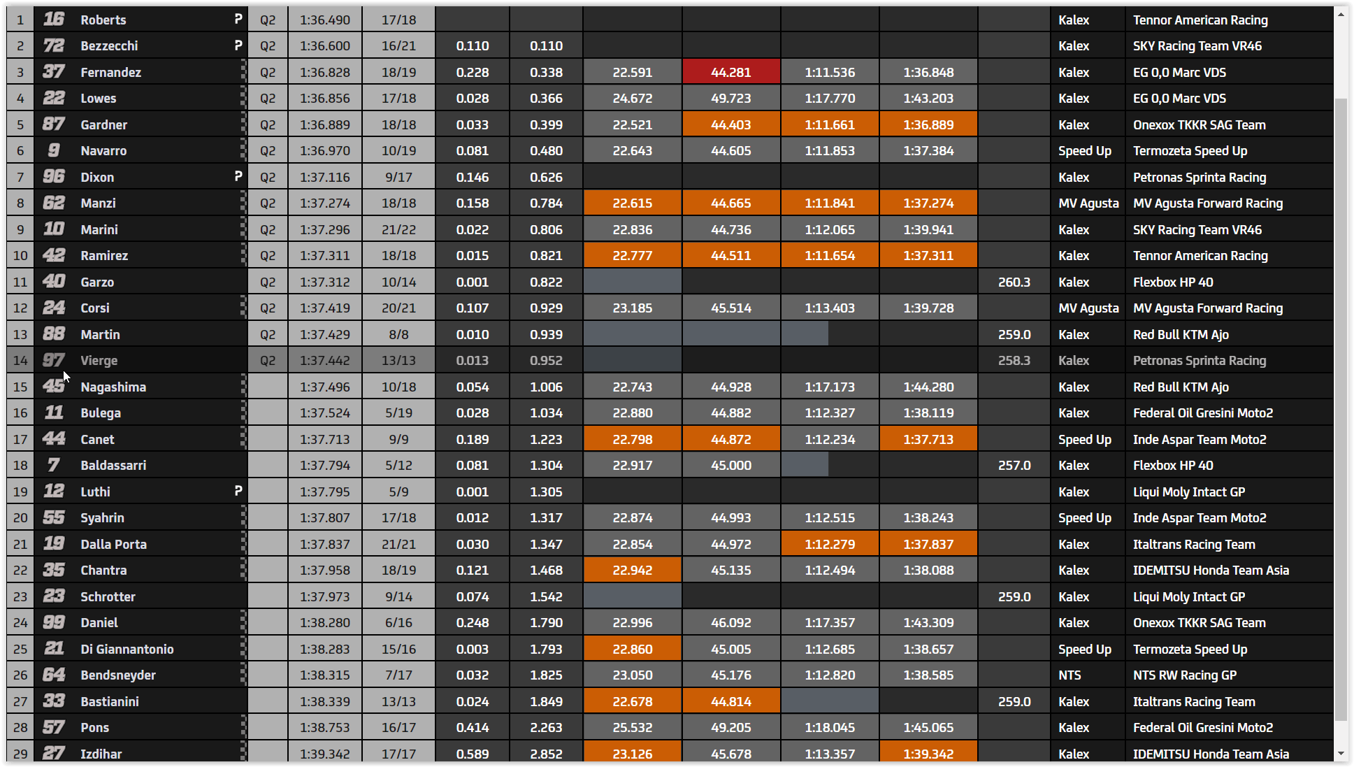 Les 14 qualifiés pour la Q2 sont: Roberts, Bezzecchi, Fernandez, Lowes, Gardner, Navarro, Dixon, Manzi, Marini, Ramirez, Garzo, Corsi, Martin, Vierge.