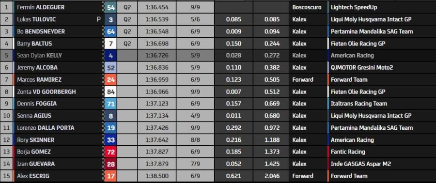 Comme prévu, Fermín Aldeguer finit cette première séance en tête. Avec lui se qualifient Lukas Tulovic, Bo Bendsneyder et Barry Baltus. Le premier lésé n’est autre que l’Américain Sean Dylan Kelly.