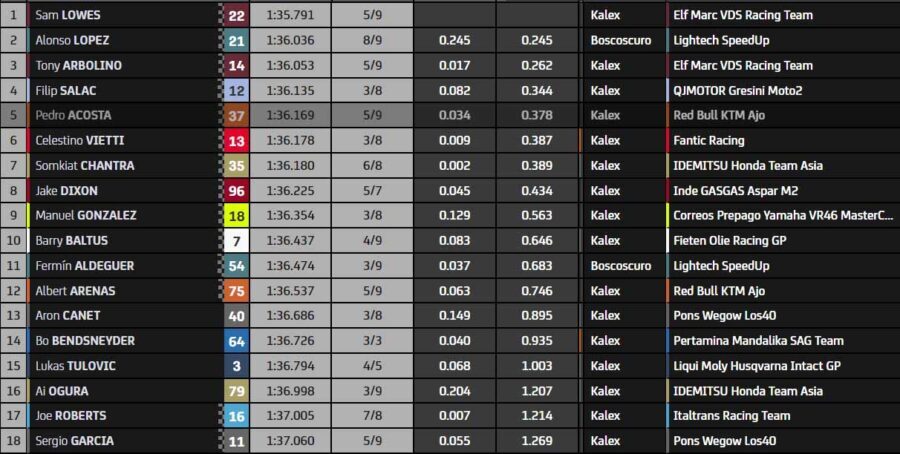 Sam Lowes était juste intouchable. Quel effort du vétéran ! Alonso López est deuxième, tandis que Tony Arbolino complète la première ligne. Une belle performance pour l’Italien, plutôt spécialiste du rythme de course.