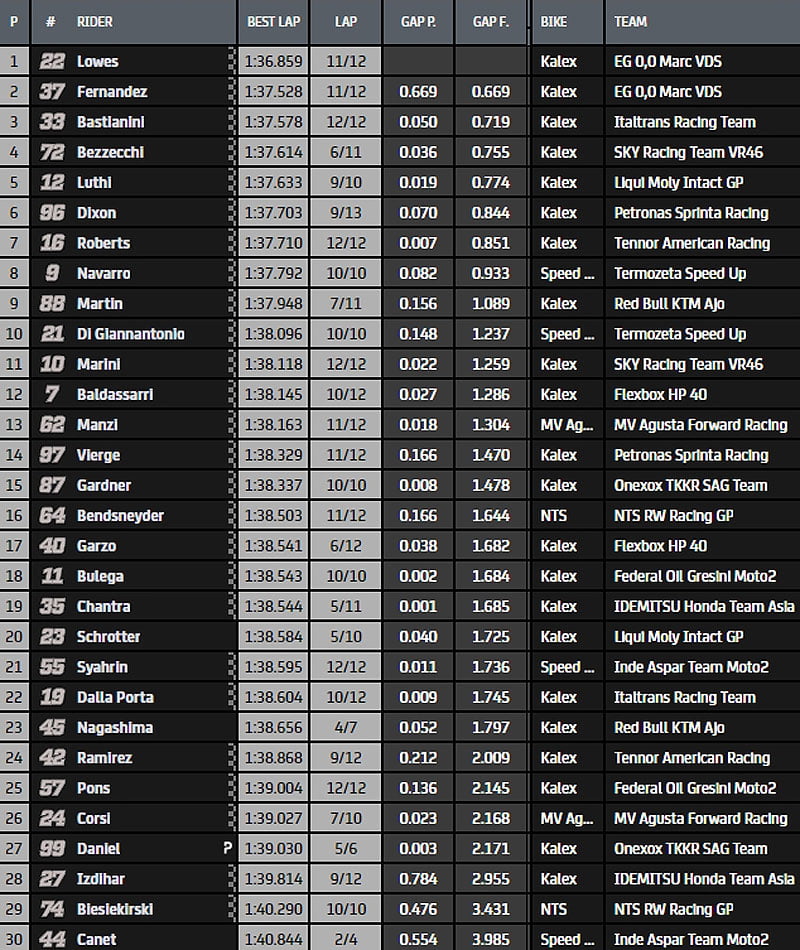 Fin de séance qui voit Lowes (1.36.859s) finir aux avants-poste devant Fernandez, Bastianini, Bezzecchi et Luthi.