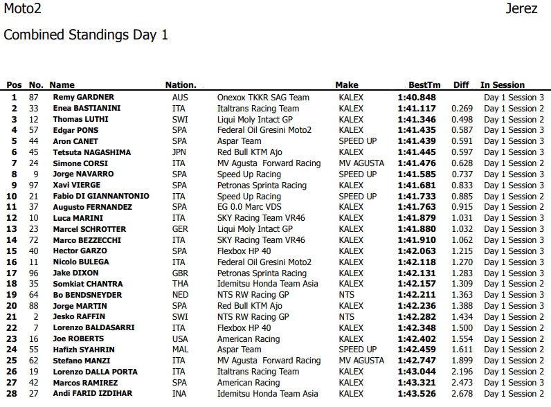 Certes, la première journée du test officiel Moto2 sur le circuit de la Frontera été dominée par le bouillant Remy Gardner. Mais, sans vouloir aucunement dévaluer la performance de l’Australien, on sait que le garçon apprécie particulièrement le tracé andalou où il a d’ailleurs réalisé le meilleur temps en FP3 la saison dernière, avant de se qualifier en quatrième position.