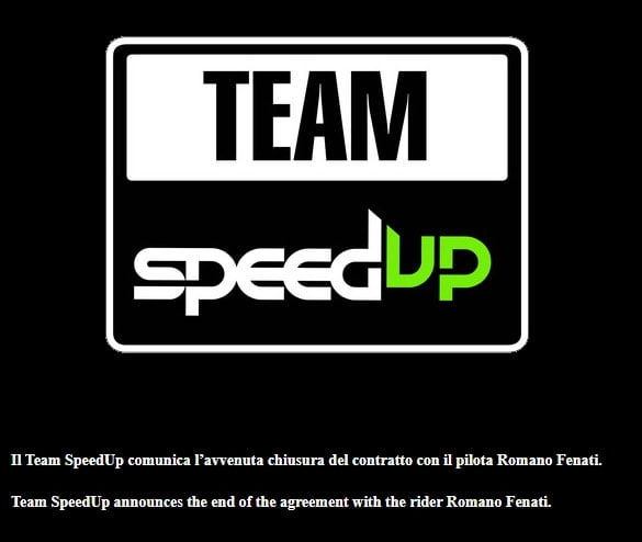 La séparation est définitive, signifiée par un communiqué laconique diffusé aujourd’hui par la structure de Vicenza : « L’équipe SpeedUp communique que le contrat avec le pilote Romano Fenati a été clôturé. »