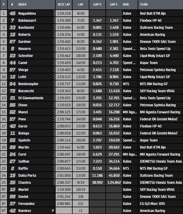 Dernier tour et c’est Nagashima qui remporte la victoire devant Baldassarri, Bastianini, Roberts et Gardner. Marini chute dans le virage 16 alors qu’il se faisait dépasser par Dixon. Navarro, Schrötter, Canet, Vierge et Lüthi ferment la marche du top10.