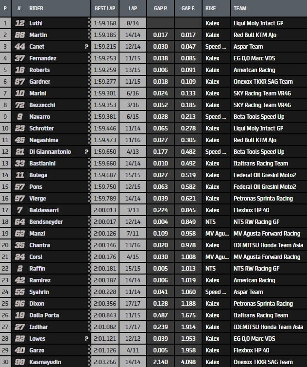 Luca Marini (Kalex, Sky Racing Team VR46) améliore la référence provisoire de quelques centièmes, en 1’59.301, offrant ainsi un trio italien en tête du classement.